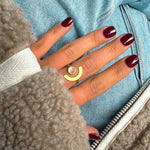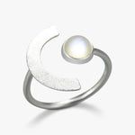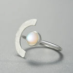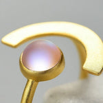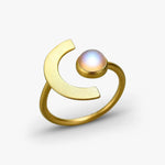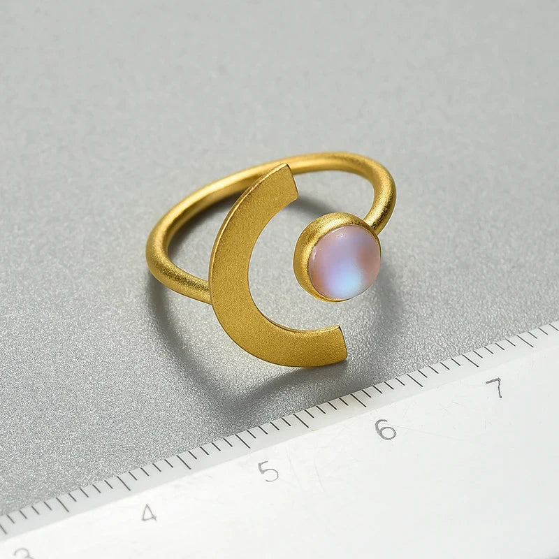 Handcrafted from solid 925 sterling silver and finished with rich 18K gold plating, its open, adjustable band offers the perfect balance of comfort and style. At its center rests a natural Solis moonstone, revered for its soft, ethereal shimmer — a stone said to awaken creativity, clarity, and confidence.