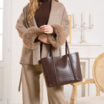 Thoughtfully detailed with gold hardware and soft vegan leather, this tote transitions seamlessly from workdays to weekends.