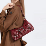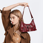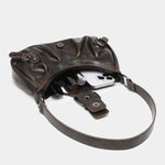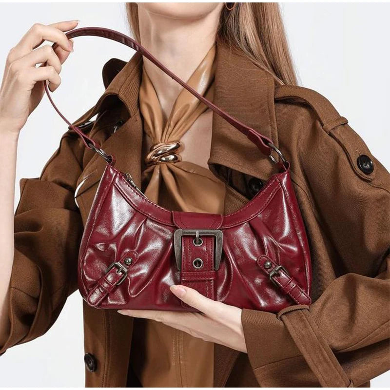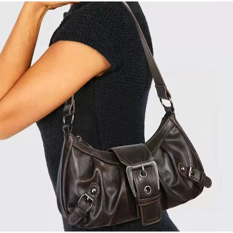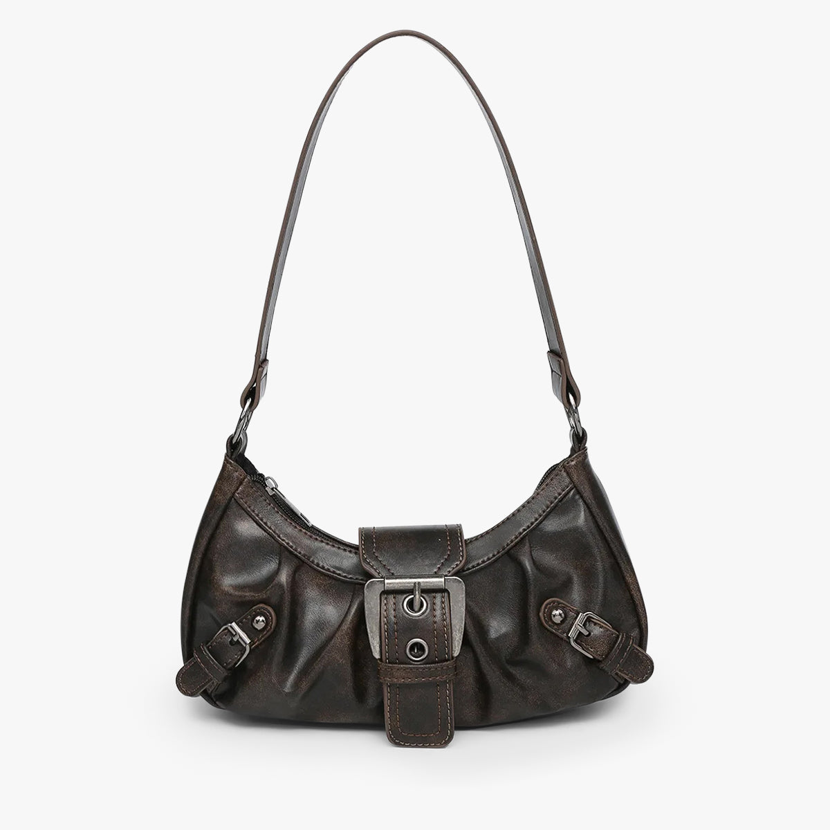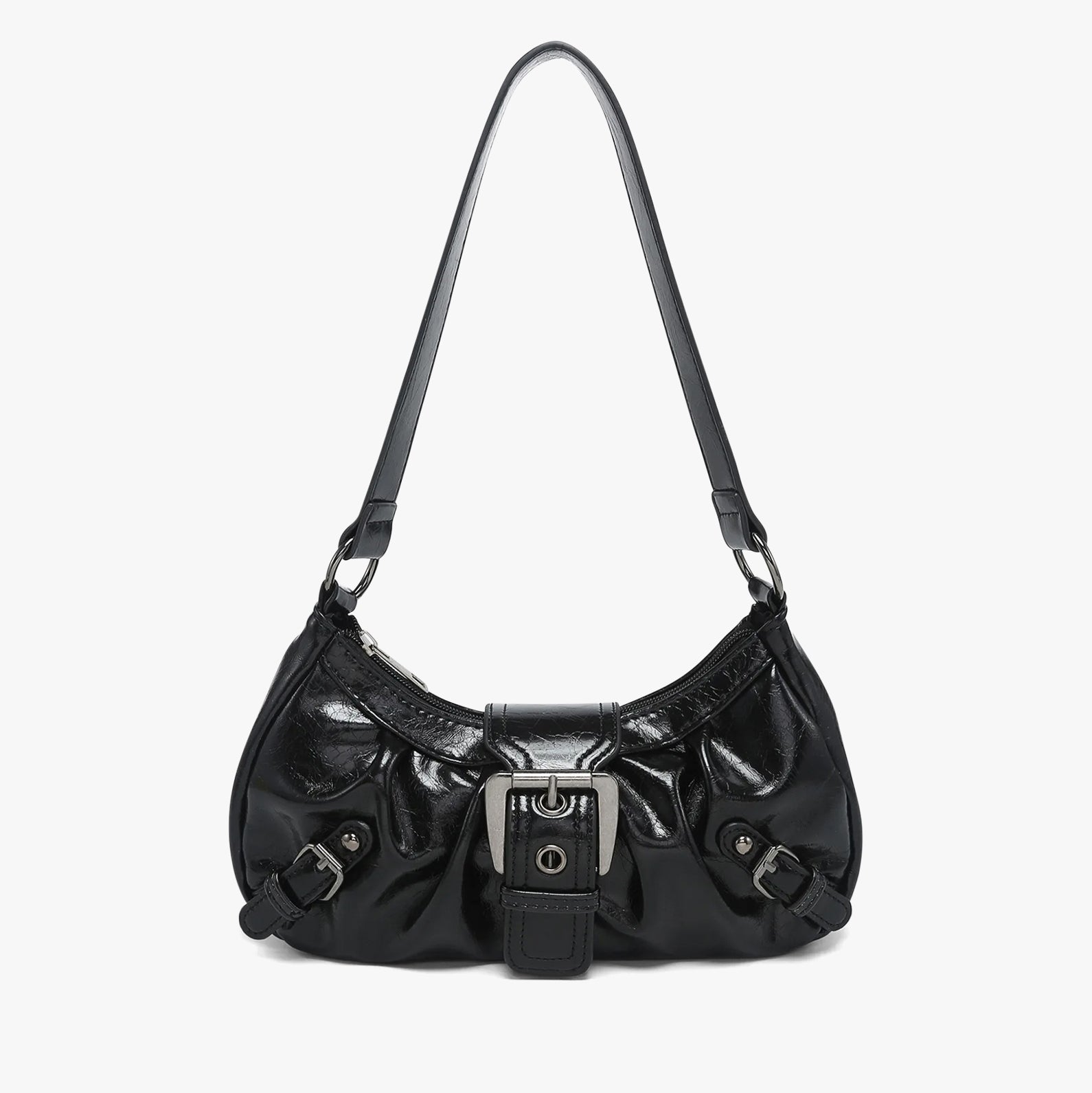 Bold, effortless, and made for the girl who moves with her own momentum — The Vega is a modern take on the classic biker-chic shoulder bag. With its curved silhouette, gathered detailing, and statement buckle hardware, it channels the attitude of vintage motorcycle culture while staying practical enough for everyday wear.